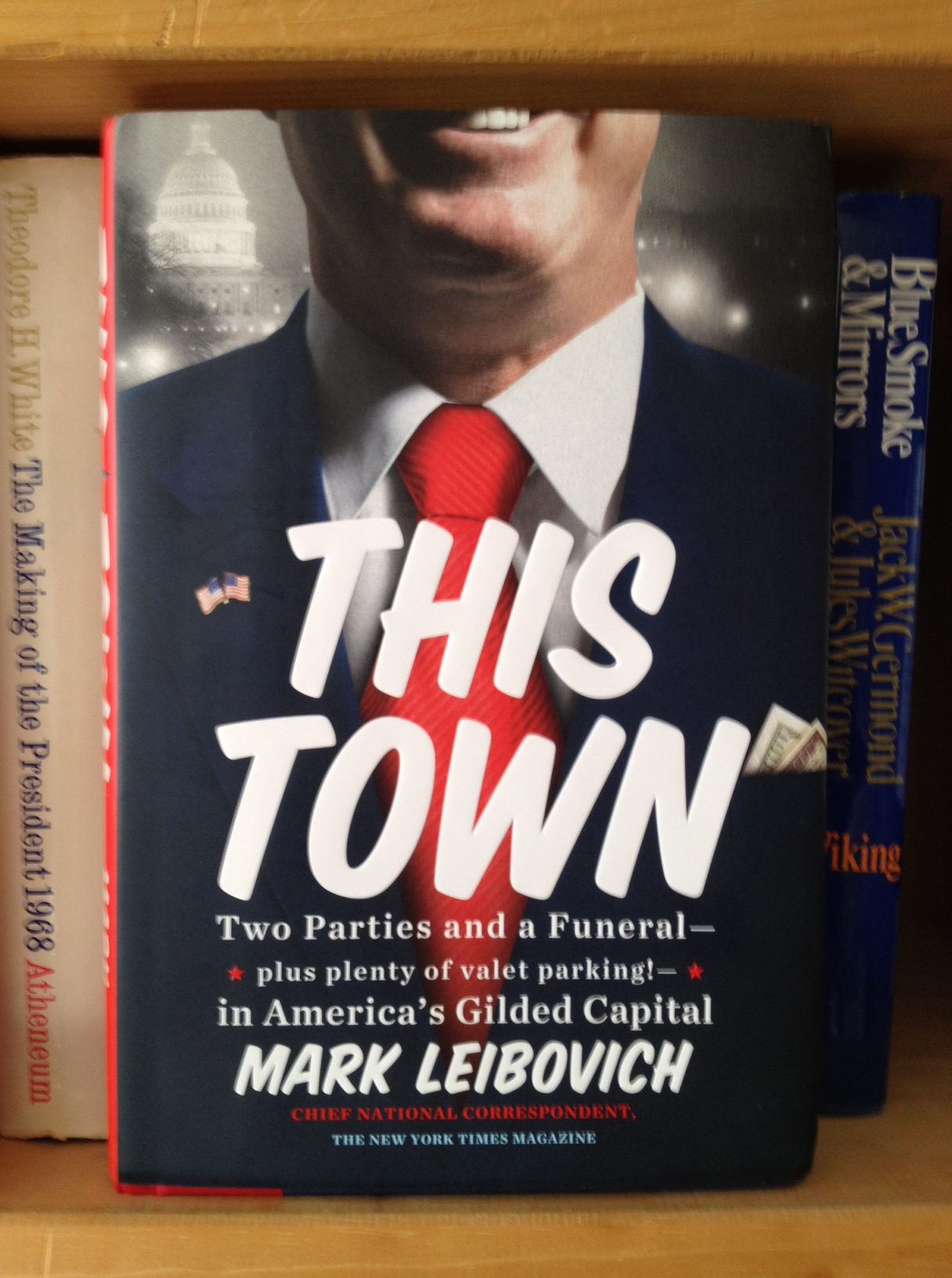 I just finished reading Mark Leibovich’s This Town (2013), a bestselling “insider” look at political life in the nation’s capital. It’s bitingly funny at times, as one might expect such a book to be, and it provides a fix for recovering political junkies like me.