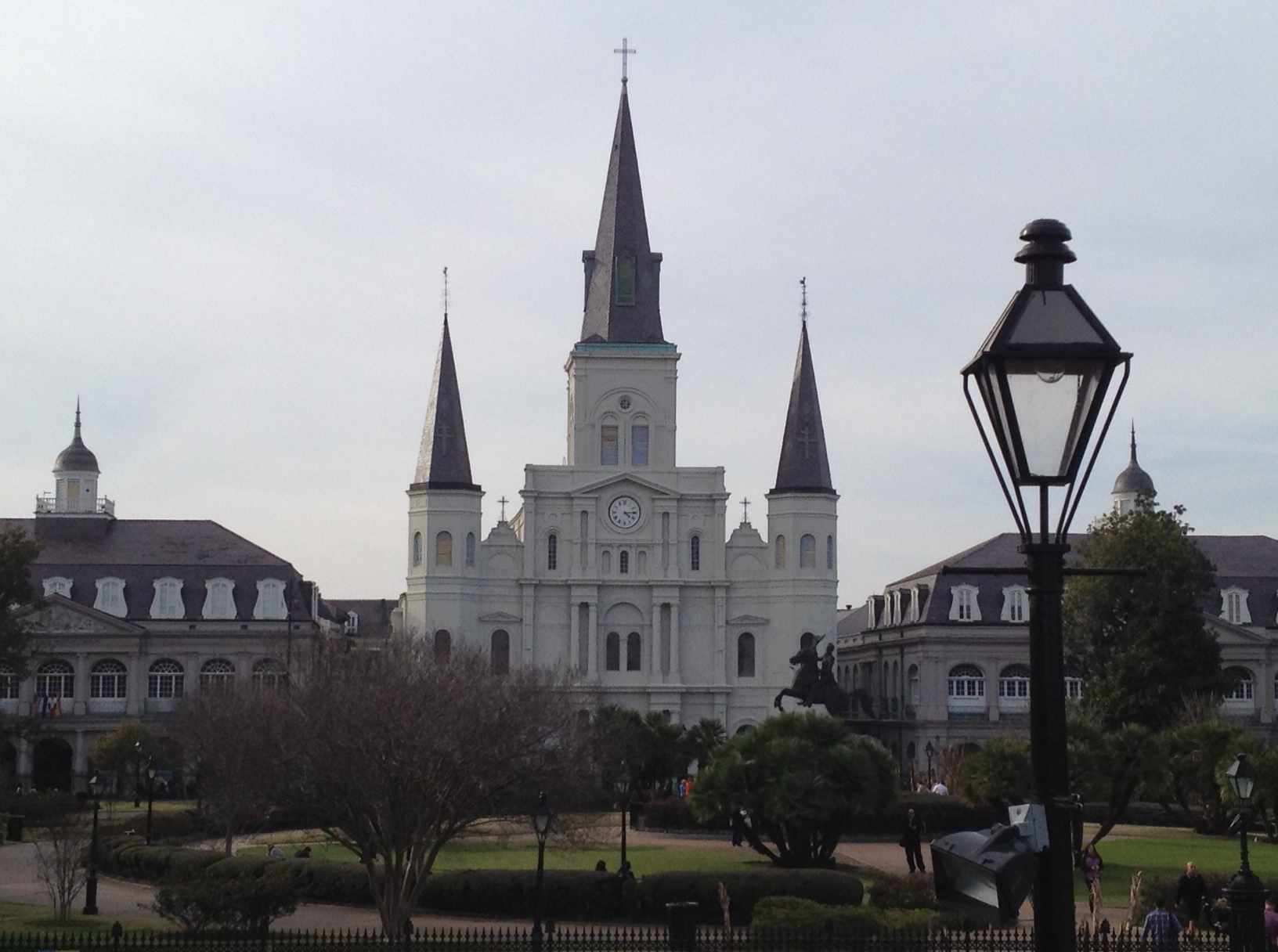Lately my vacations have been limited to extended weekend trips and add-on days to work-related travel, and thus I tend to explore places I visit in short stretches. Fortunately I can dig into a city like New Orleans, especially its historic French Quarter, even if I have only a couple of days to do so. For starters, I took a great walking tour of the Quarter sponsored by Friends of the Cabildo, a non-profit organization dedicated to preserving Louisiana’s history. From that tour, here’s a shot of the St. Louis Cathedral, the oldest operating cathedral in North America:
