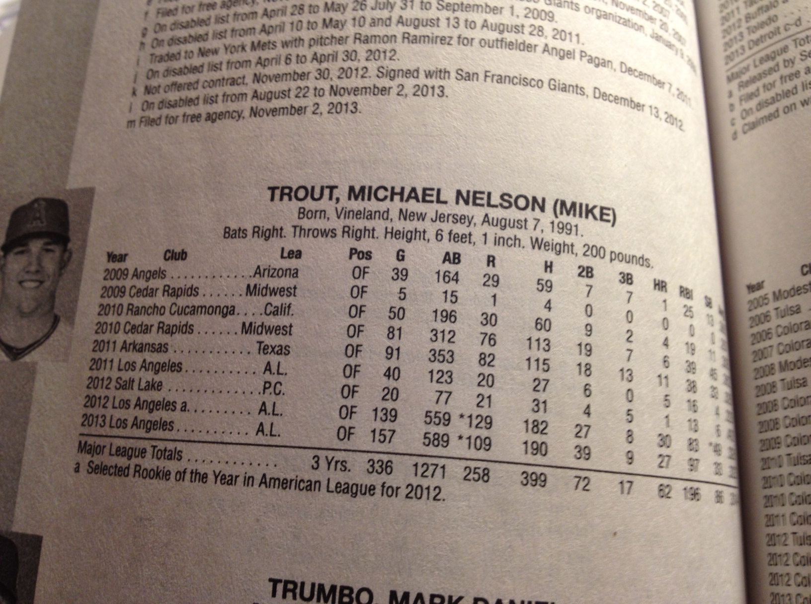 Although baseball statistics are now big business — practically everything about the game that can be measured with numbers appears in print or online somewhere these days — the basic format of Who’s Who hasn’t changed much over the decades. A devoted Who’s Who reader from the 1970s could look at the page below from the 2014 edition and instantly recognize where it came from.