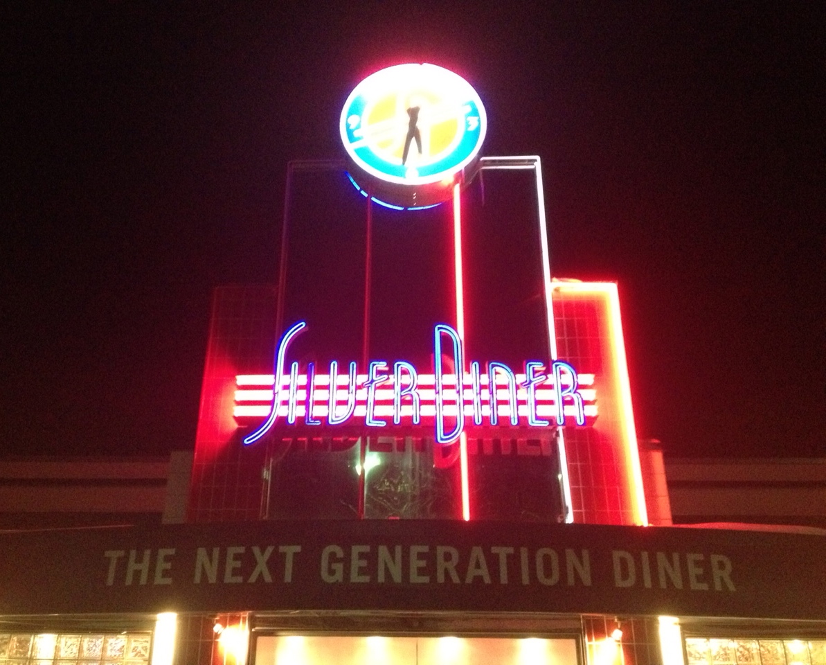 Pictured above is the Silver Diner in Reston, Virginia, part of a small chain in the Washington D.C. metro region. When I visit friends in Northern Virginia, a meal at the Silver Diner is usually part of my stay. Breakfasts, burgers, dinner platters, desserts — all very good, at decent prices.