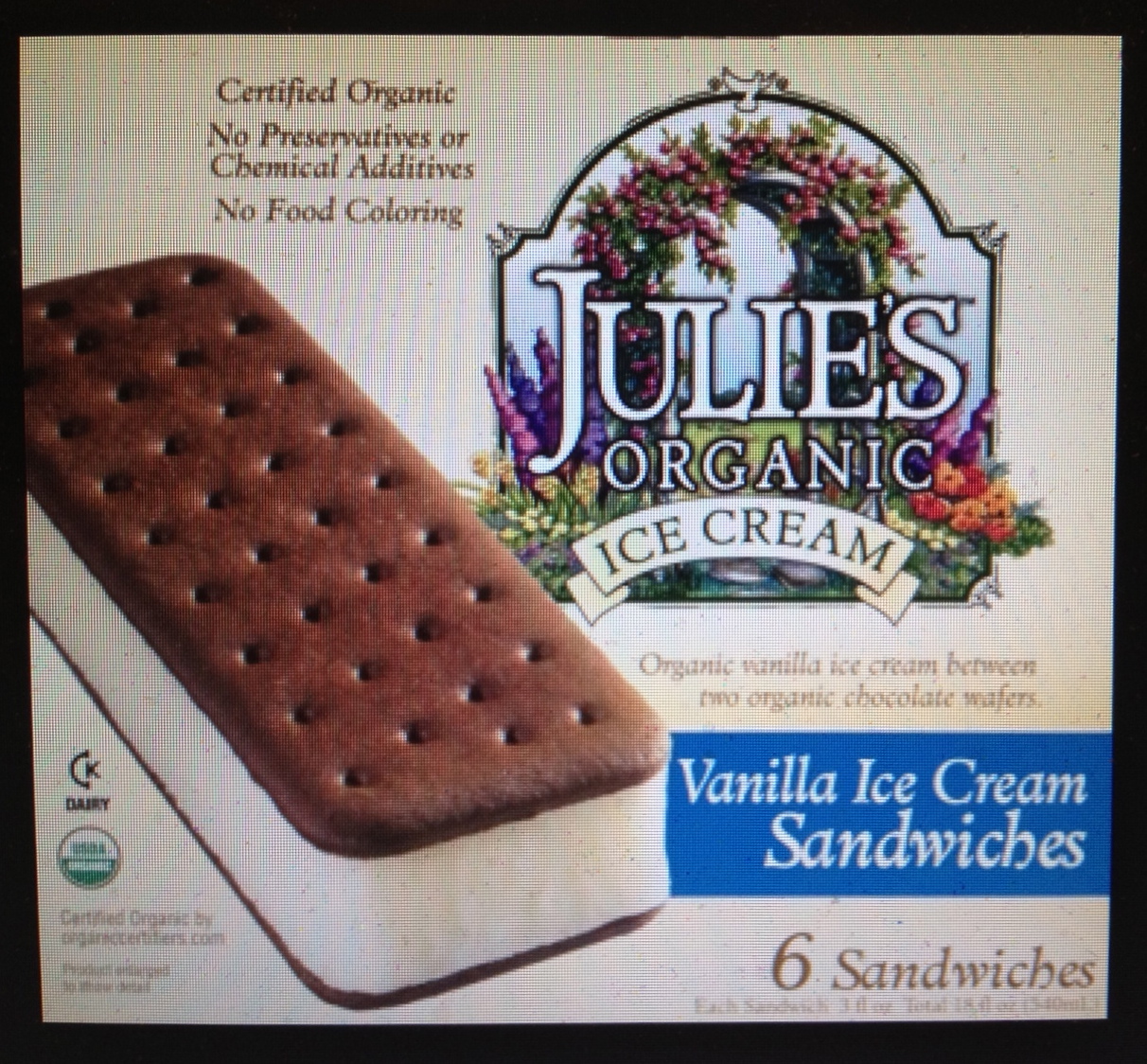 Even today, I much prefer the old-fashioned, unadorned, long rectangular ice cream sandwich with two chocolate wafers and vanilla ice cream. (For some reason, I’m less enamored of overstuffed ice cream sandwiches that are harder to manage.) However, I, too, have gone a bit upscale. My current ice cream sandwich of choice is Julie’s organic brand, which I’ll purchase by the box a couple of times a year from the City Feed & Supply store across the street from my home: