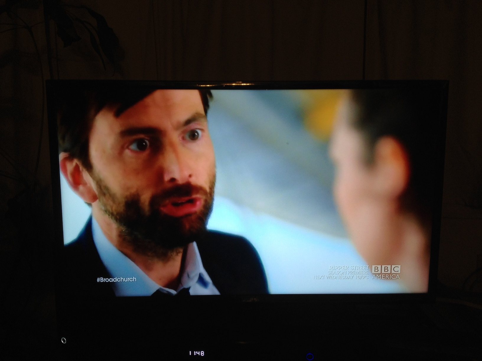On Wednesday, after teaching an evening class and heating up some leftover Chinese food for a late dinner, I wanted to watch something halfway decent on television for an hour. Fortunately, I had recorded the evening’s episode of Broadchurch (BBC America), a British crime drama set in a small coastal community, full of complicated relationships and interesting, intense, edgy characters. The show co-stars David Tennant and Olivia Colman as detectives dealing with a murder case that has shaken them and the local citizenry.