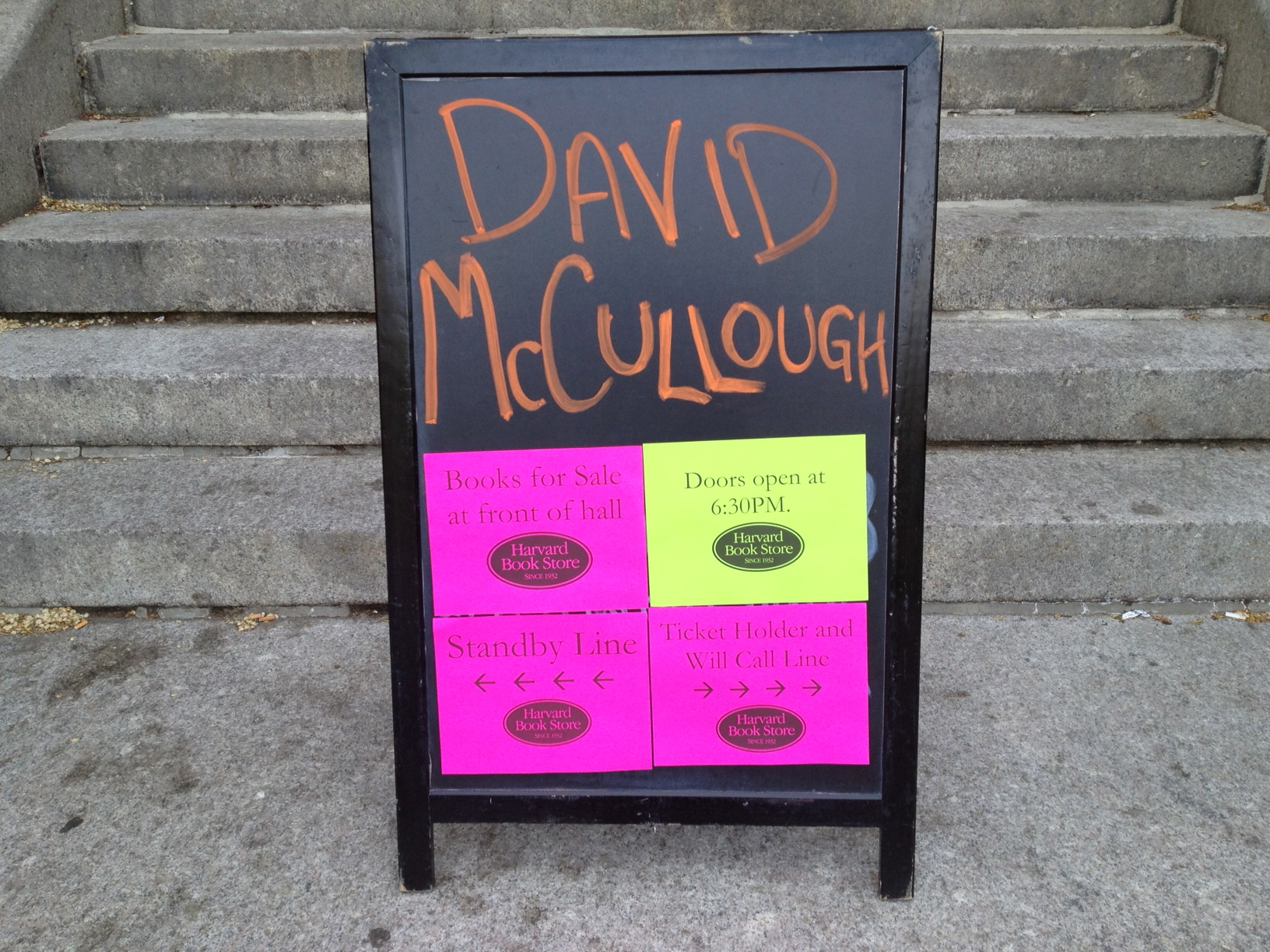McCullough spoke in Cambridge as part of the Harvard Book Store speaker series to a packed house at the First Parish church.