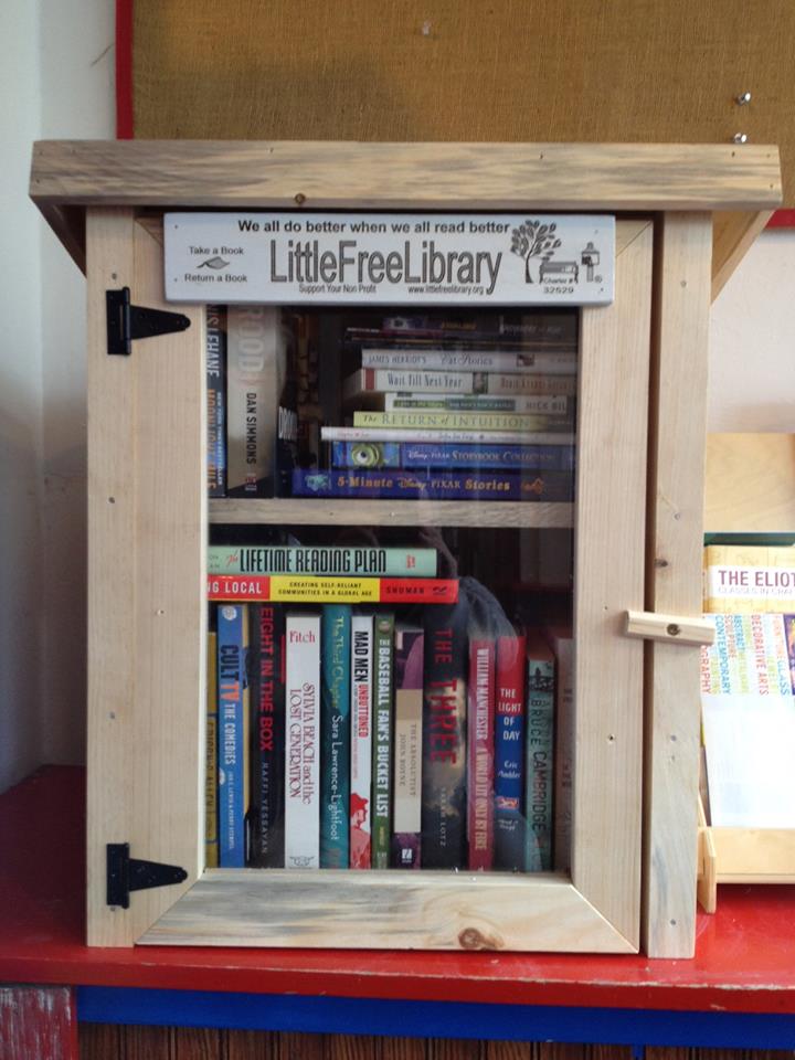 Recently I arranged with the co-owners of City Feed & Supply, one of the wonderful, socially conscious businesses in my Boston neighborhood of Jamaica Plain, to place a Little Free Library in their Boylston Street store. City Feed is a popular neighborhood gathering spot, offering a variety of coffee drinks, freshly-made sandwiches, and health-minded groceries, and I thought it would be a perfect home for a Little Free Library.