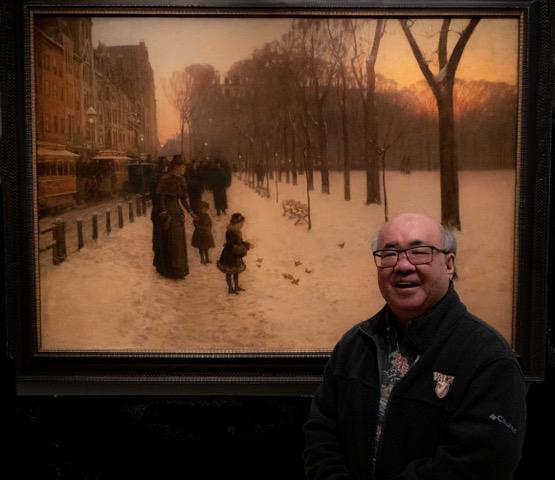 Appreciating “At Dusk (Boston Common at Twilight),” by Childe Hassam, 1885-86, during a recent trip to the Museum of Fine Arts with long-time friends Don and Sharon Driscoll, visiting from Illinois (photo credit to Sharon)