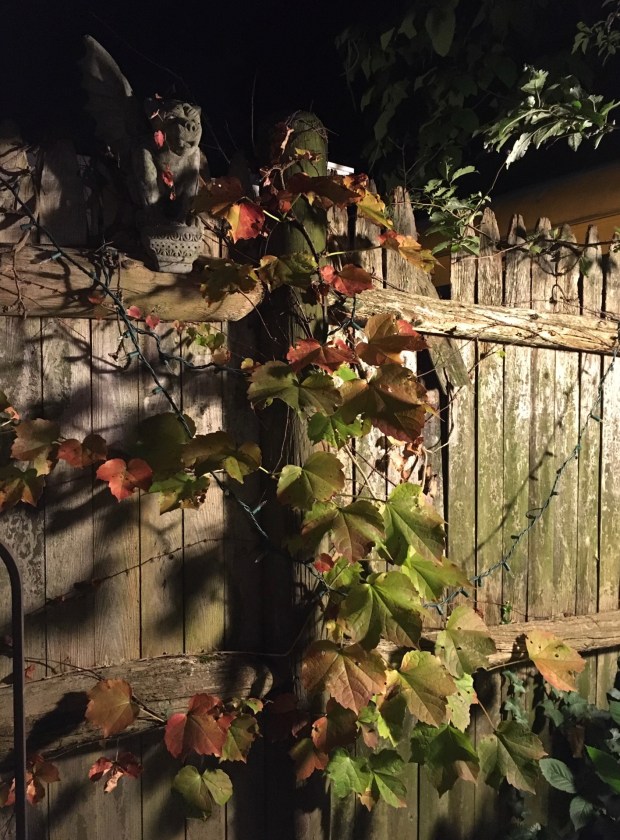 I have been living very carefully during this pandemic. Here in my Boston neighborhood of Jamaica Plain, my socializing has been limited to socially distanced, outdoor cookout dinners with my long-time friends Martha and Myra, who encouraged me to move to this wonderful ‘hood many years ago. I have photos of neither our meals nor our persons, but here’s a stylish shot I took of their backyard fence as dusk settled in.