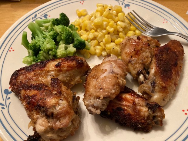 I discovered that a mix of olive oil, crushed bread crumbs, sea salt, and pepper resulted in fall-off-the-bone, baked chicken wings — done with my toaster oven. I was surprised how much I enjoyed these wings. I need to make these again.