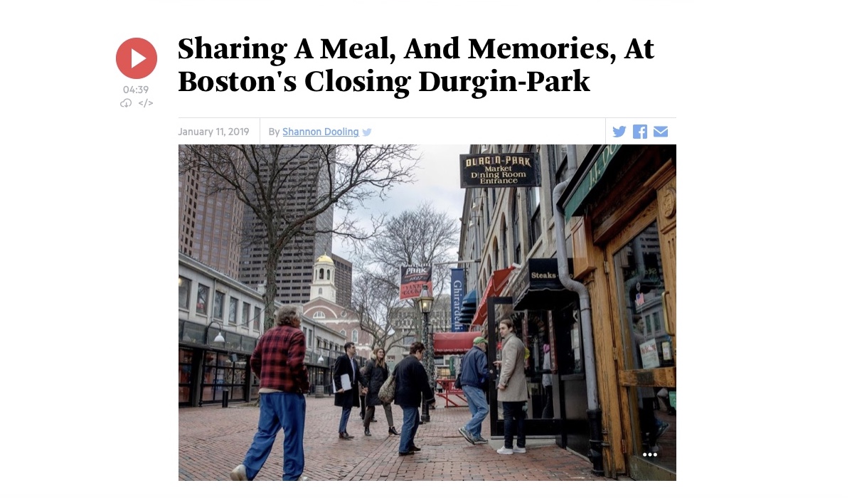 The closing of Durgin-Park has been big news here in Boston, with much of the coverage sharing nostalgic reminiscing over meals, family gatherings, and visits to the city. Here’s the lede from a piece by Shannon Dooling of WBUR public radio: