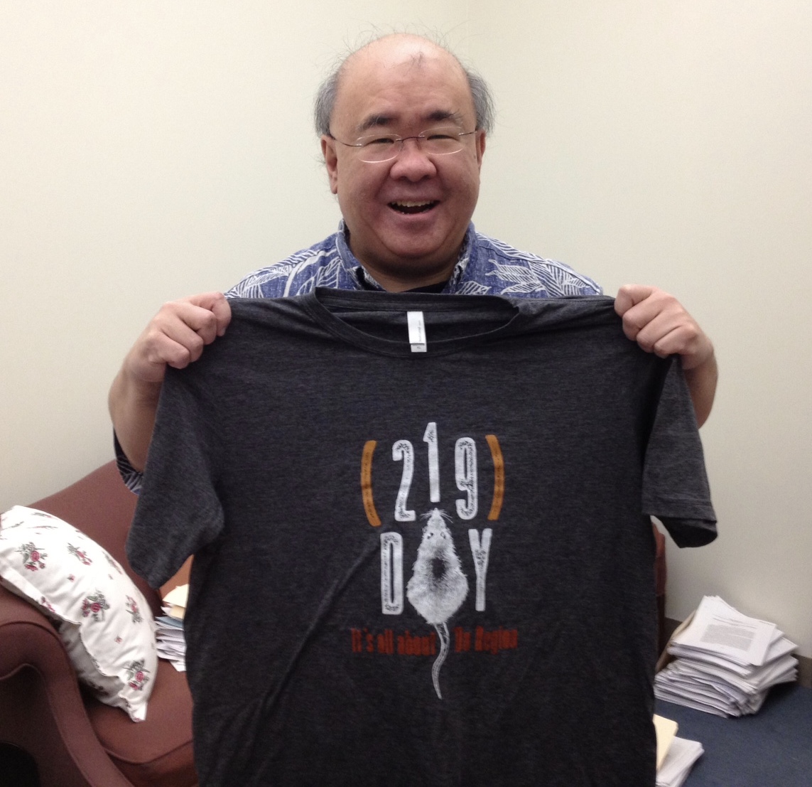 In fact, when I saw folks posting stickers for 219 Day on Facebook, I contacted one of my Region schoolmates, Dave Woerpel, now Chairman of the Hammond Democrats and a close associate of the Mayor, and asked how I might get my hands on one. Well, not only did Dave send me a couple of stickers, but also to my surprise he sent a 219 Day t-shirt (“219 Day, It’s all about Da Region”), which I proudly show off in the photo above. It is a fitting addition to my leisurewear collection. Perhaps some Bostonians will ask for an explanation!
