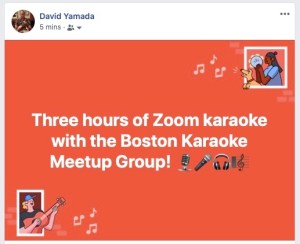 Singing is my favorite hobby, and I’ve missed it terribly. For years I’ve taken a weekly voice workshop through a local adult education center, and more recently I’ve become a regular at a downtown Boston karaoke club. Months before the coronavirus hit, I had also discovered this wonderful karaoke meetup group. Sadly, the pandemic has forced all of these activities to stop, and it may be a while before they return. That’s why I’m especially grateful that we can harness online technology to bring folks together to sing, however distanced for now.