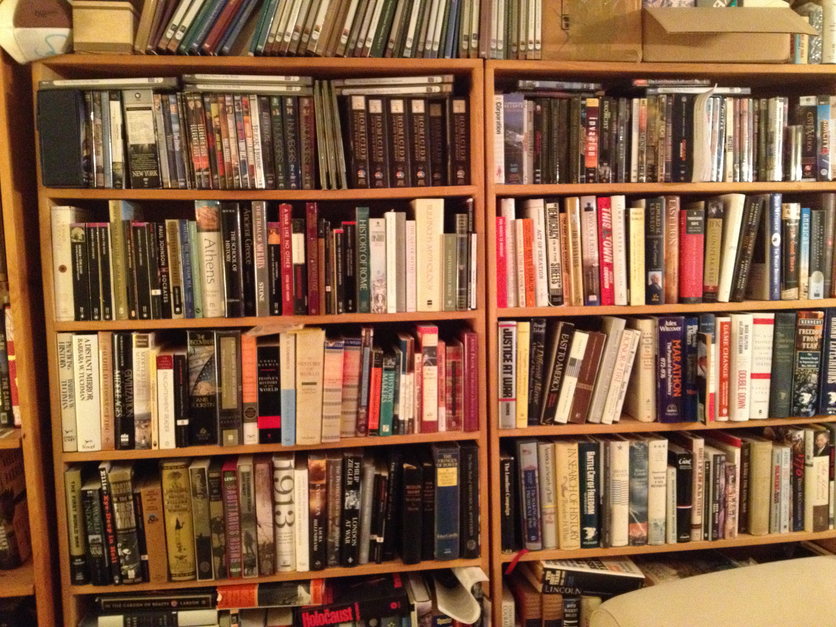 Why am I doing this? Well, as you can see from photos of some of my bookshelves below, my space at home has basically run out. (It’s worse at my university office.) But more importantly, I am facing the fact that I bought many of these books under a hazy assumption that I would have eons of time to (1) read even the books I’m only casually interested in, and (2) pursue a virtually endless array of writing projects. Now that I’m in my mid-fifties, I know that will not be the case.