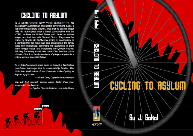 I just finished a terrific novel, Su Sokol’s Cycling to Asylum (2014), described by the author as “the story of a family that flees a near-future New York City and crosses the border into Québec by bicycle to demand political asylum.” I’m going to be a bit lazy and let Su’s website synopsis do the work of describing its essence: