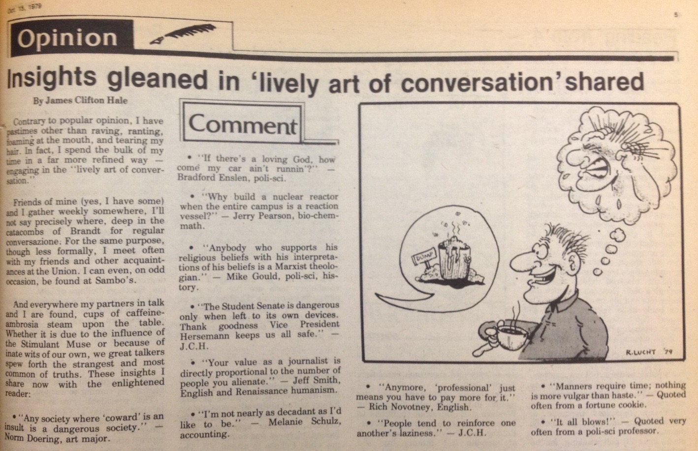 Only a handful of Torch staffers would build careers in journalism. One of them, Jim Hale (author of the “Insights gleaned” column pictured above), is currently a reporter for the Gettysburg Times in Pennsylvania. Previously Jim was a writer for the Gettysburg College communications office and a reporter for the Chesterton Tribune in Indiana.